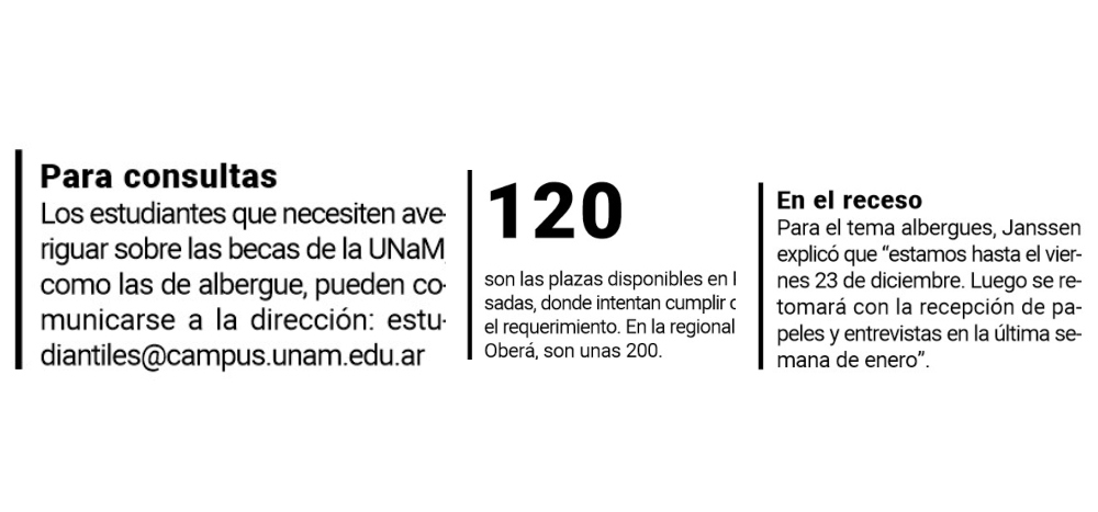 El secretario general de Asuntos Estudiantiles de la UNaM, Alexis Janssen, contó a PRIMERA EDICIÓN que “estamos en proceso de presentación de papeles de los estudiantes renovantes y se está empezando a hacer las evaluaciones con el gabinete”. Respecto al número de plazas disponibles, en el sector Campus “hay alrededor de 120 disponibles y estamos teniendo muchas solicitudes de albergues. Los chicos ya comenzaron a entregar papeles e iniciar las entrevistas”.